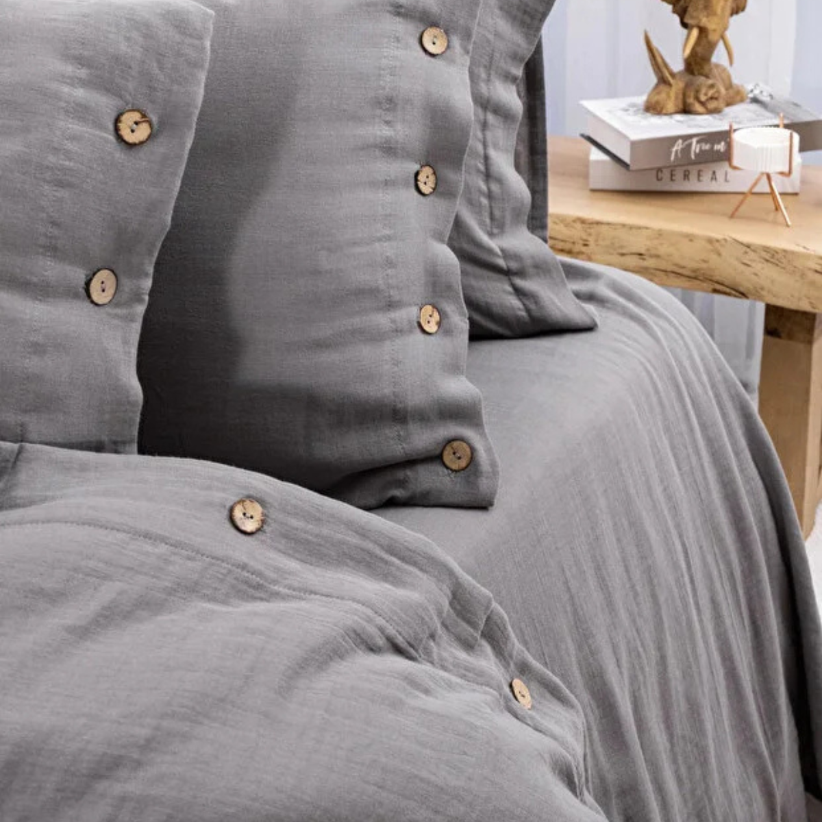 De set is voorzien van stijlvolle kokosnootknopen, die een natuurlijke en elegante touch geven en het luxe karakter van de dekbedovertrek set versterken.